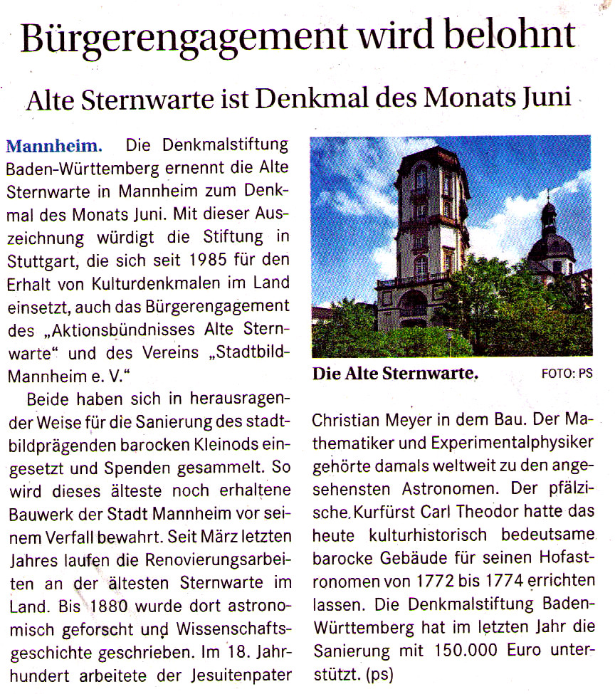 Die Denkmalstiftung Baden-Württemberg ernennt die Alte Sternwarte in Mannheim zum Denkmal des Monats Juni. Das Wochenblatt berichtet darüber in seiner Ausgabe vom 29. Mai: