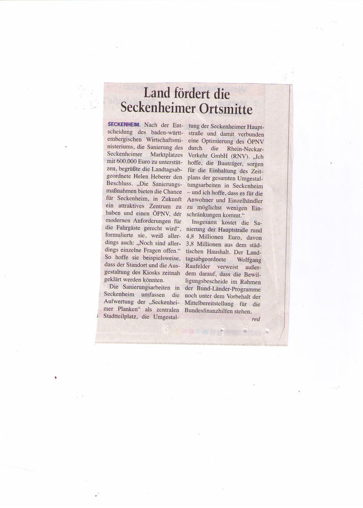 Die Seckenheim-Rheinau-Nachrichten berichten am 16. Mai über einen Zuschuss, den das Land Baden-Württemberg für die Sanierung der Seckenheimer Ortsmitte bewilligt hat: