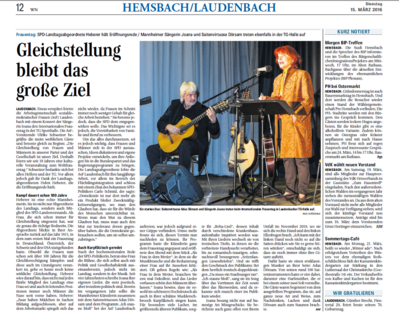 Frauentag: SPD-Landtagsabgeordnete Heberer hält Eröffnungsrede / Mannheimer Sängerin Joana und Saitenvirtuose Dörsam treten ebenfalls in der TG-Halle auf