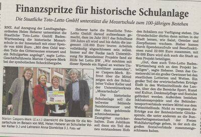 Heberer hatte die Staatliche Toto-Lotto GmbH darauf aufmerksam gemacht, dass im Jahr 2017 das Schulhaus 100 Jahre alt wird und bis dahin die insgesamt 135 000 Euro teuren Arbeiten vollständig abgeschlossen sein sollen. Immer auf der Suche nach Unterstützung für Mannheimer Projekte fand sie Hilfe bei Lotto BW. "Wir möchten mit dieser Spende ein Signal an weitere Unterstützer aussenden", so Caspers-Merk. Erfreut über die Mittel zeigen sich der Schulrektor Volker Keller, und der Unterstützerkreis "Mozartschule".